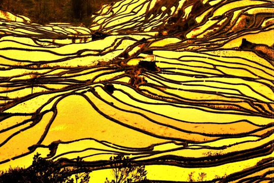 麻栗寨景区梯田面积大、壮观、线条美、立体感强。从海拔1100米的麻栗寨河起,连绵不断的成千上万层梯田,直伸延至海拔2000米的高山之巅,把麻栗寨、坝达、上马点、全福庄等哈尼村寨高高托入云海中。站在麻栗寨茶厂观梯田,近万亩的梯田宛如一片坡海,泛着粼粼波光,奔来眼底,景色十分壮观,每当下午四时后,白茫茫的坡海随着夕阳西下,逐渐变成粉红色、红色。再转变成粉红色、白色。是观赏和拍摄梯田随时光变化而变化的地方。哈尼族村落风光奇丽,民风敦厚,村民待客十分热情。